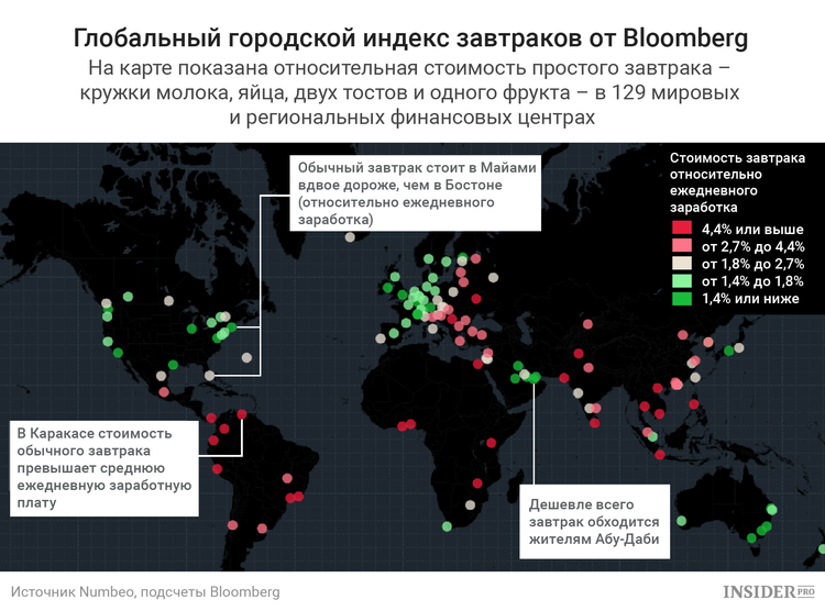 Индекс, составленный Bloomberg, показывает среднюю стоимость и доступность обычного завтрака — кружки молока, яйца, двух тостов и фрукта — в 129 мировых и региональных финансовых центрах. Рейтинг основан на рыночных ценах на эти продукты за последние 12−18 месяцев по данным Numbeo.com (база данных, составляемая пользователями сайта, которые делятся статистическими сведениями о жизни в различных городах и странах). Согласно индексу, относительная стоимость завтрака в некоторых экономических зонах может резко отличаться в разных городах.