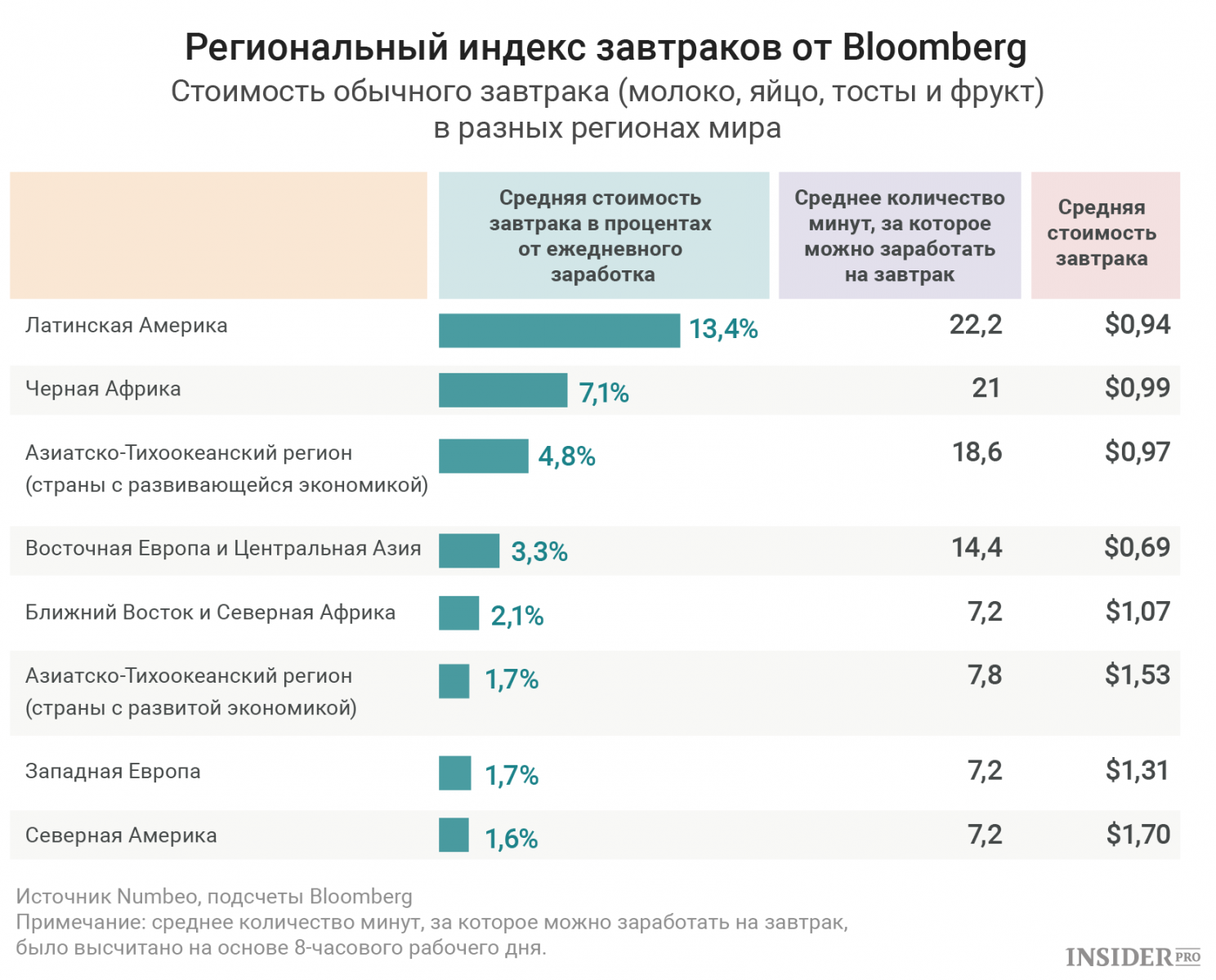 В Азии стоимость завтрака колеблется от менее 1% в японской Осаке до 12% во вьетнамском Ханое. Самый сильный контраст наблюдается в Латинской Америке: 2,4% в Монтеррее (Мексика) и 111% в Каракасе (Венесуэла).