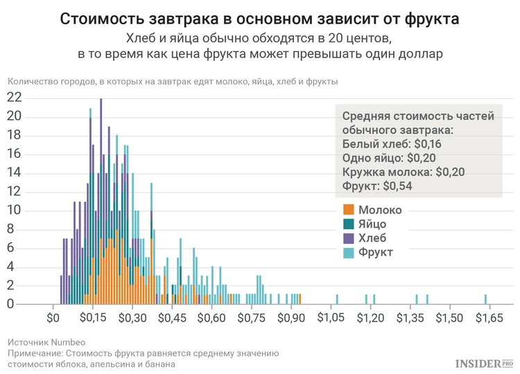 Большие различия в относительной стоимости завтраков связаны также с рыночными и законодательными условиями в тех или иных регионах. Так, в Каире существуют дотации на продукты питания, и стоимость завтрака составляет всего $0,35 (дешевле всего в мире), а на небольших рынках, ориентированных на импорт, существуют высокие наценки. Поэтому в столице Бермуд Гамильтоне завтрак обойдется вам в $3,48.