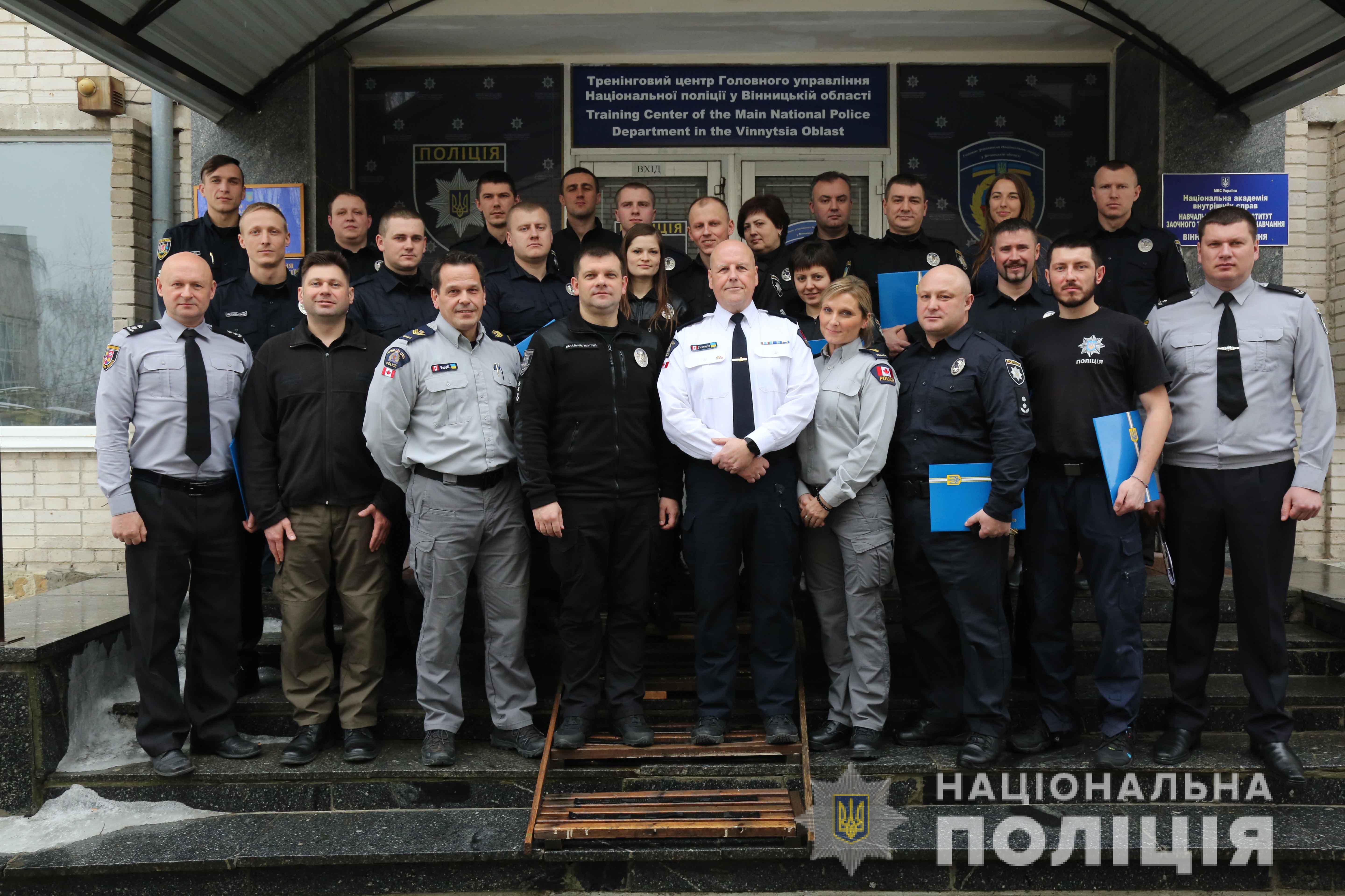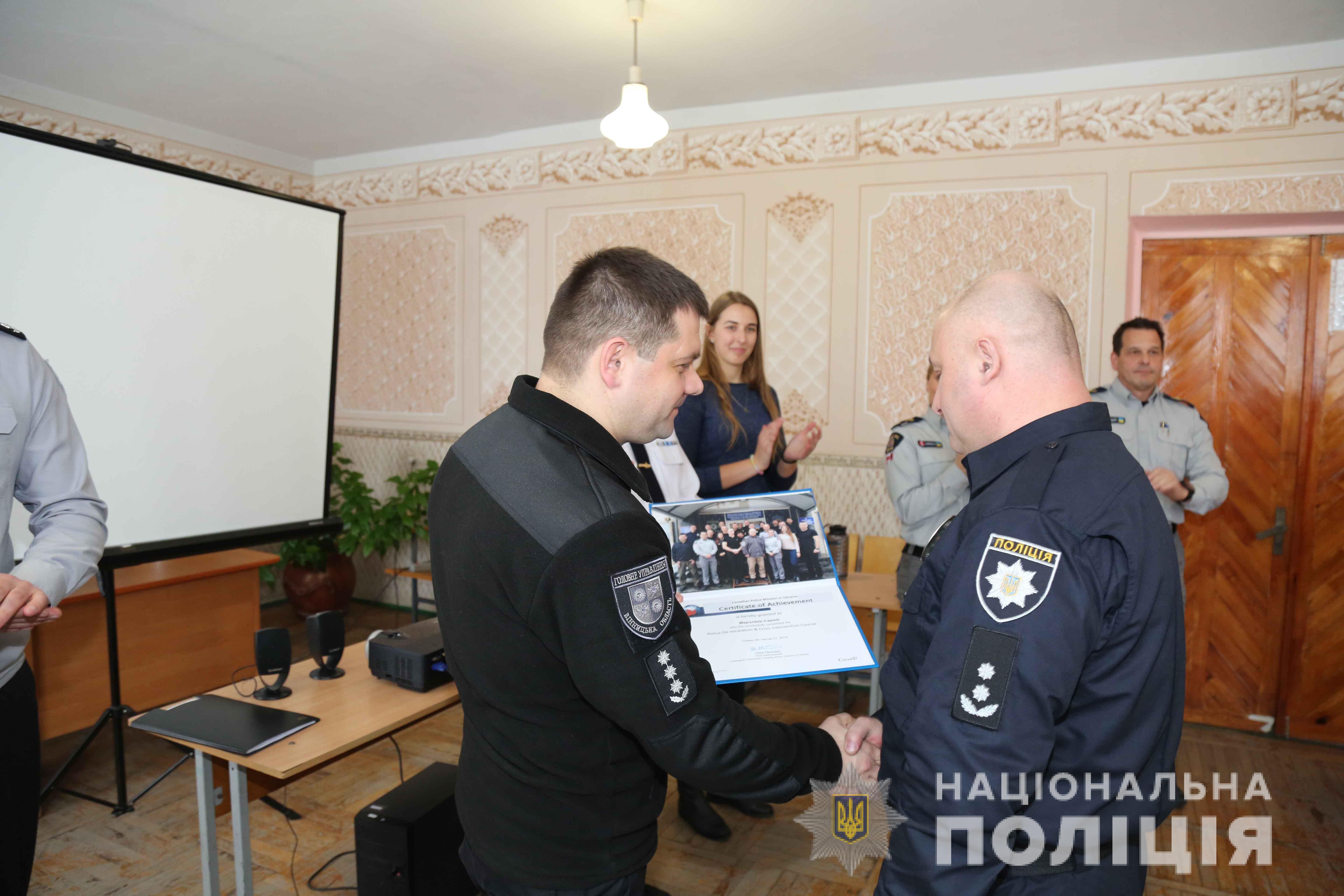 Сьогодні, 1 лютого, в тренінговому центрі ГУНП у Вінницькій області відбулось вручення дипломів поліцейським, які пройшли навчання за курсом «Дії поліцейських у кризових ситуаціях-деескалація», організовані представниками Канадської поліцейської місії в Україні.