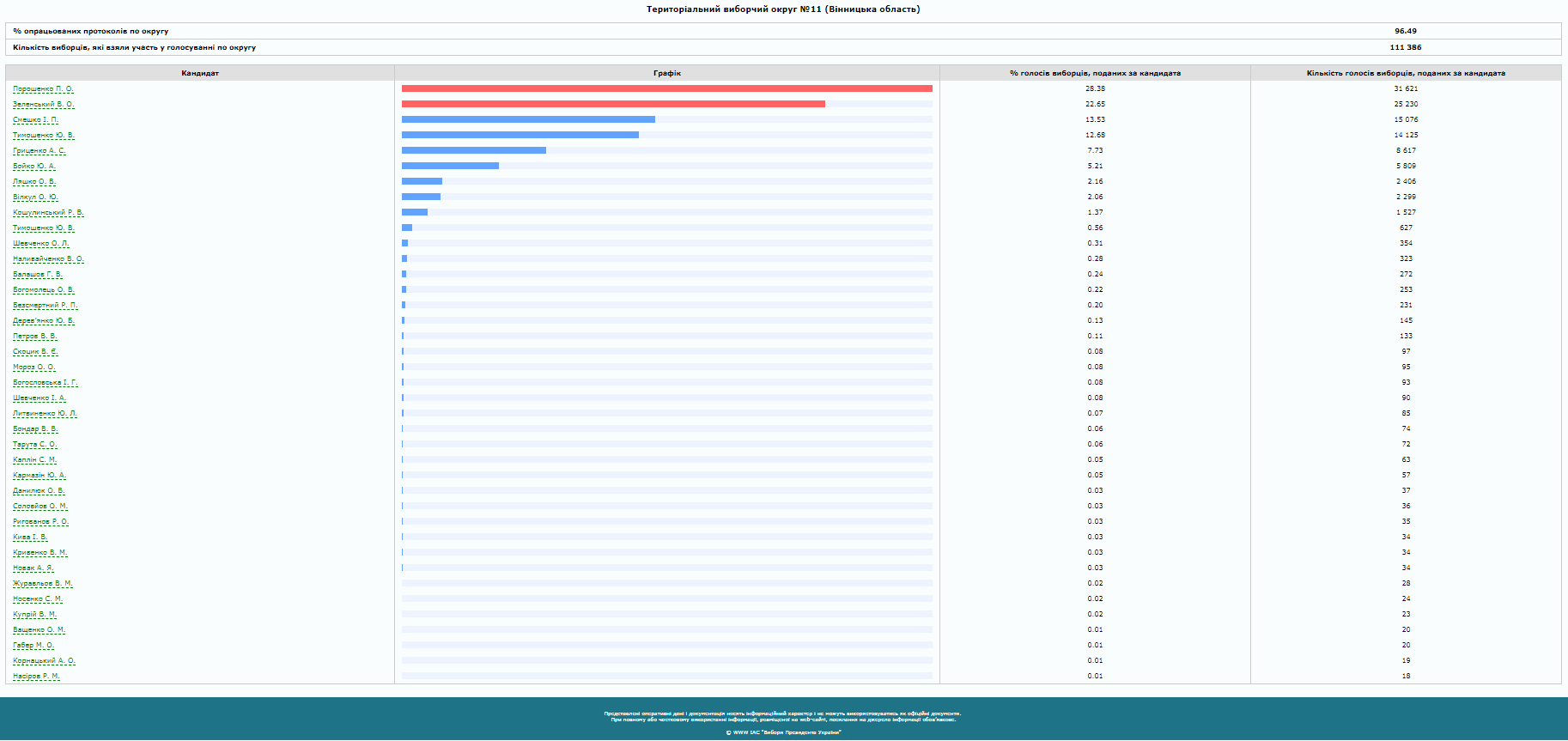 Так, по виборчому округу №11 (частина Вінниці та Вінницького района) – опрацьовано 96,49% протоколів: 28, 38% виборців віддали голоси за чинного Президента Петра Порошенка. На другому місці з 22,65% голосів – Володимир Зеленський, на третьому – Ігор Смешко (13, 53%), а Юлія Тимошенко опинилася на четвертому з 12, 68% голосів.
