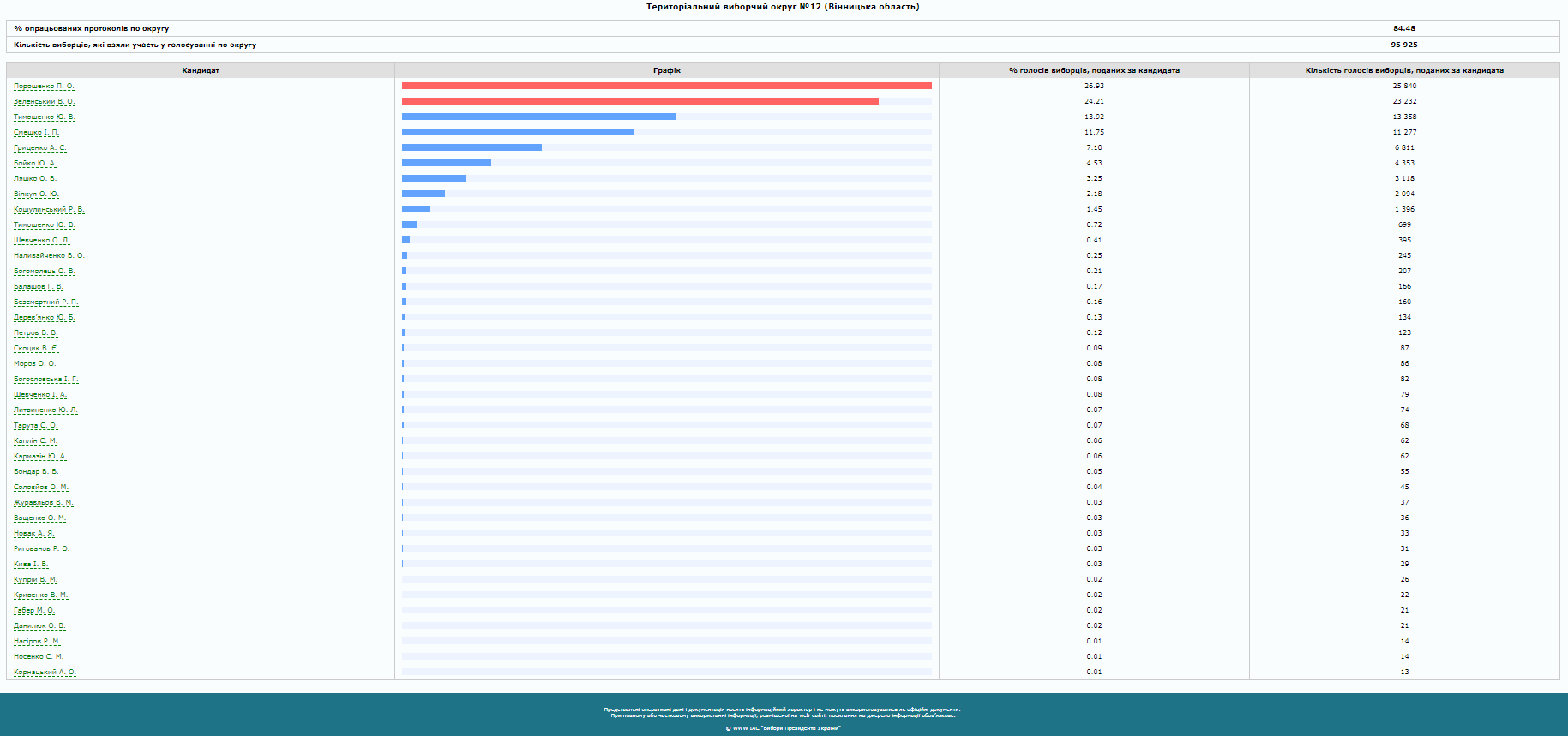 – опрацьовано 84,48% протоколів: Петро Порошенко лідирує з 26, 93% голосів, у Володимира Зеленського – 24,21%, третє місце – в Юлій Тимошенко – 13,92%, а Ігор Смешко – на четвертому – з 11, 75%.