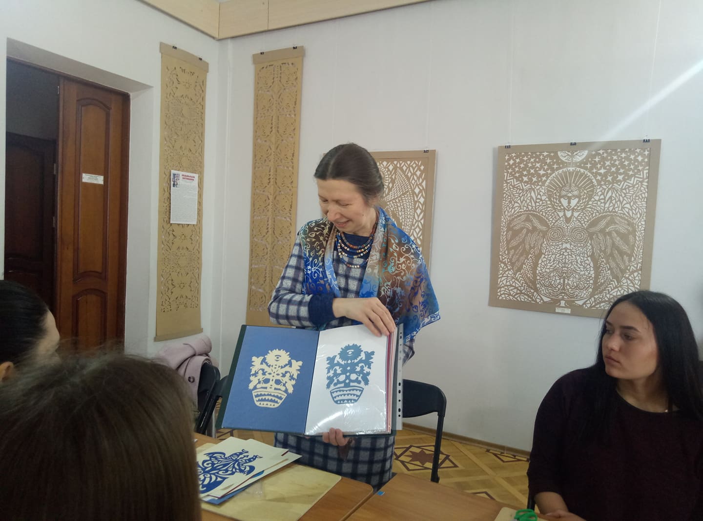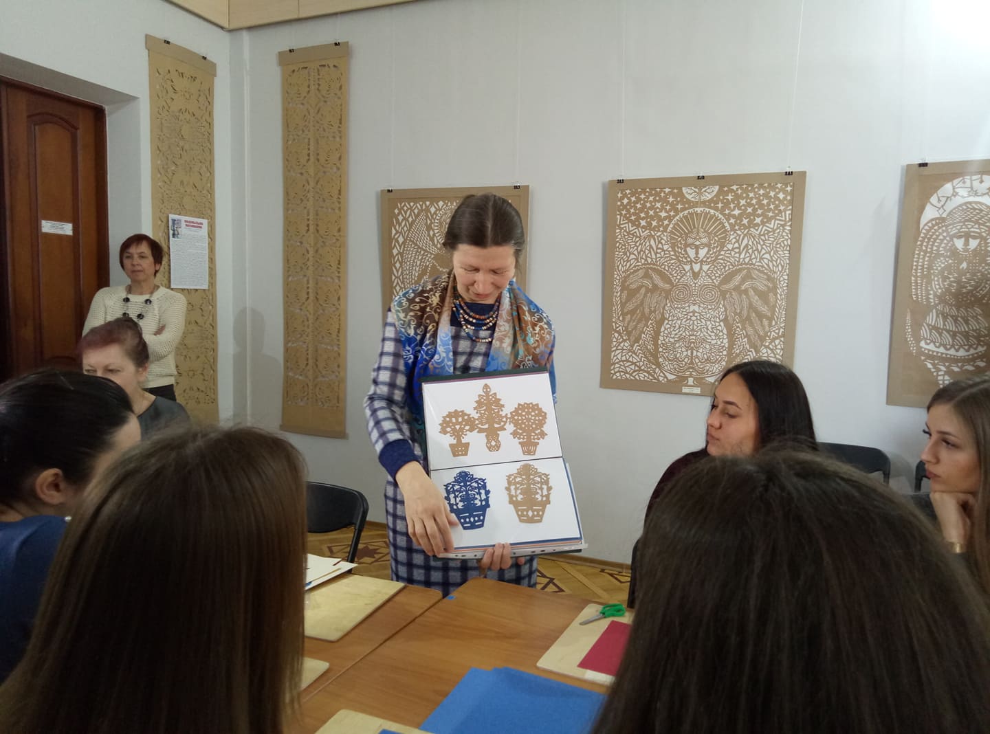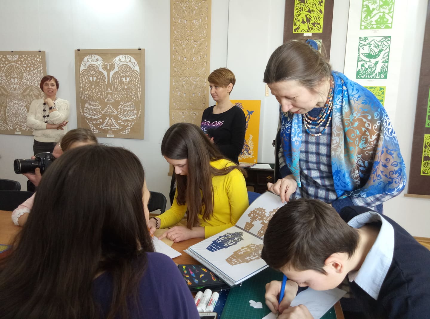 Майстер-клас Світлани Жукової розпочався із ознайомлення учнів із видами робіт у стилі витинанки. У творчому доробку педагога – чимало готових робіт, які можна було перемалювати та переробити по-своєму.