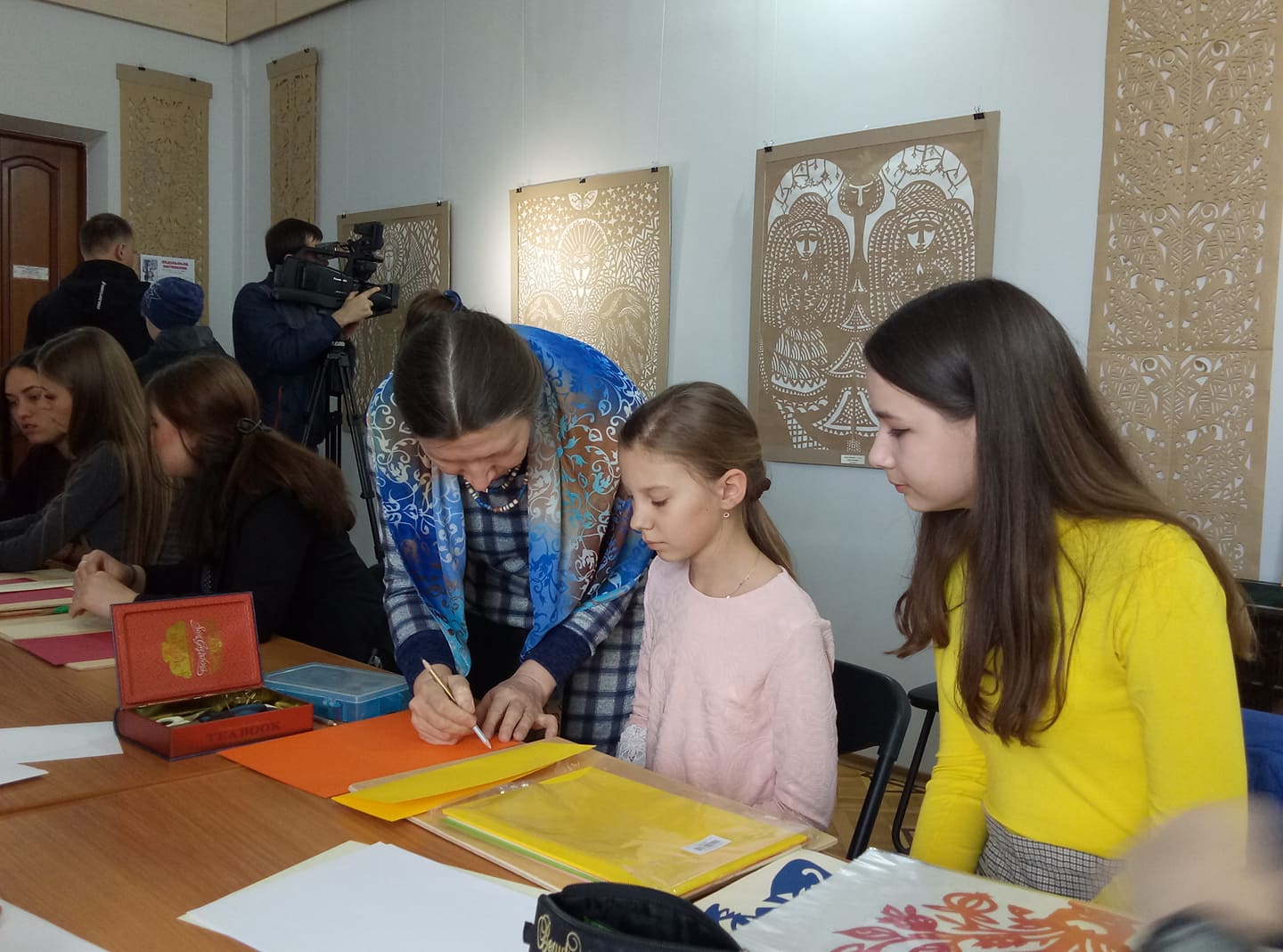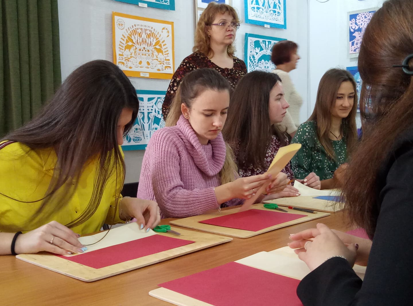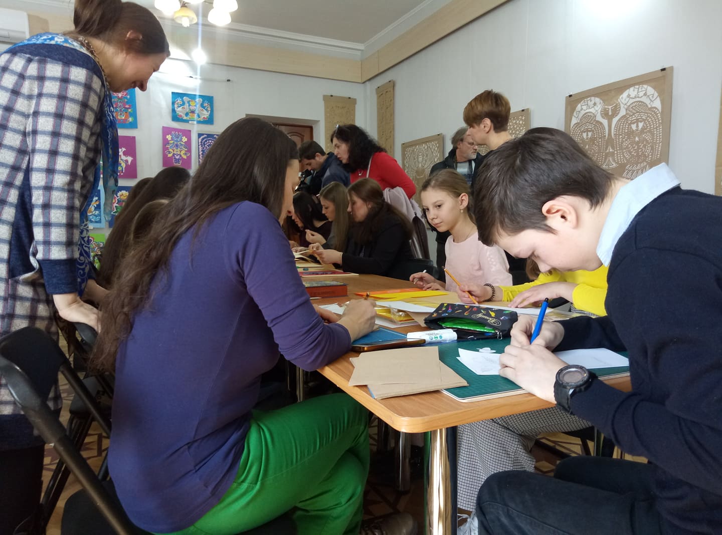 Майстер-клас Світлани Жукової розпочався із ознайомлення учнів із видами робіт у стилі витинанки. У творчому доробку педагога – чимало готових робіт, які можна було перемалювати та переробити по-своєму.