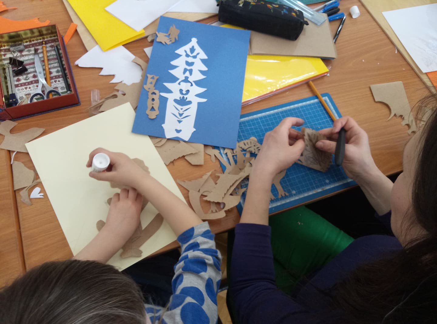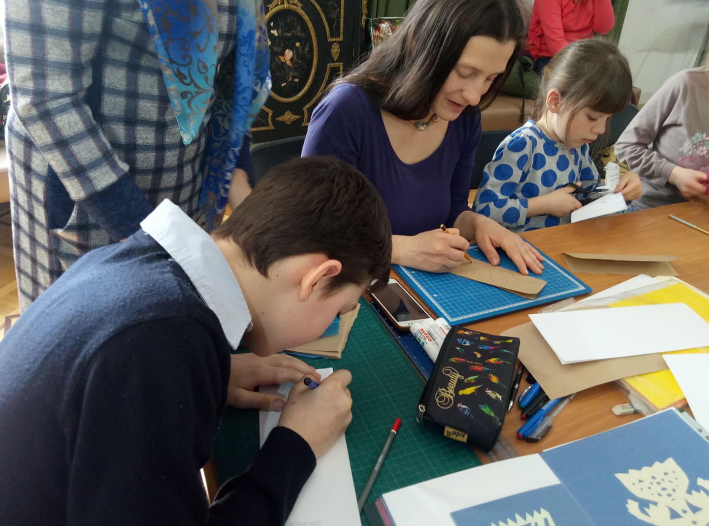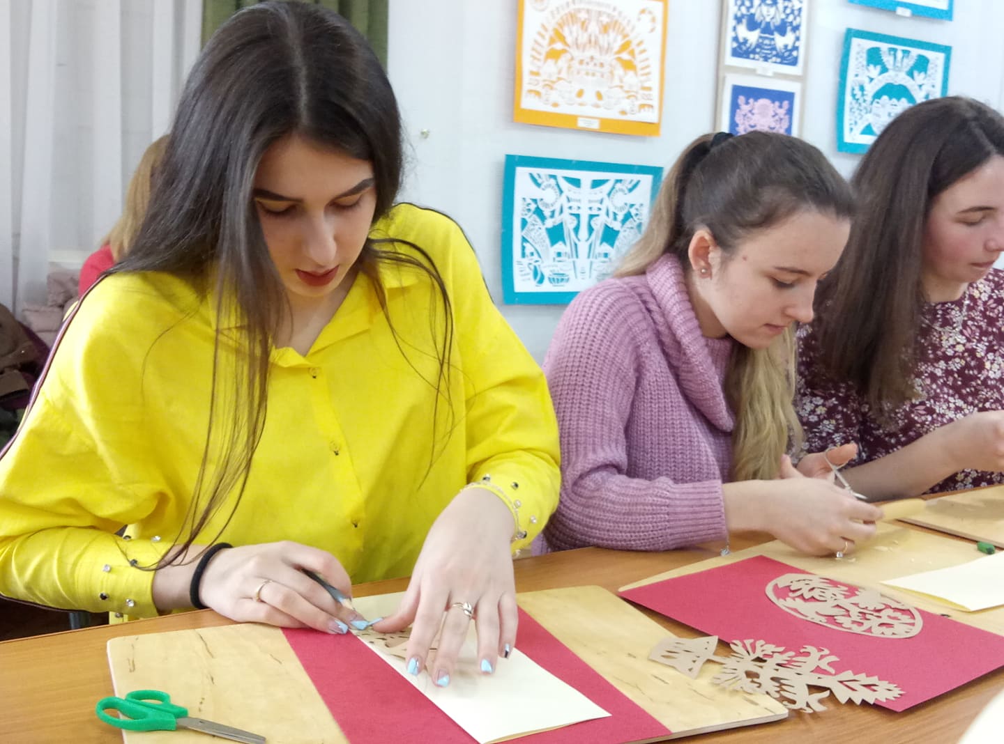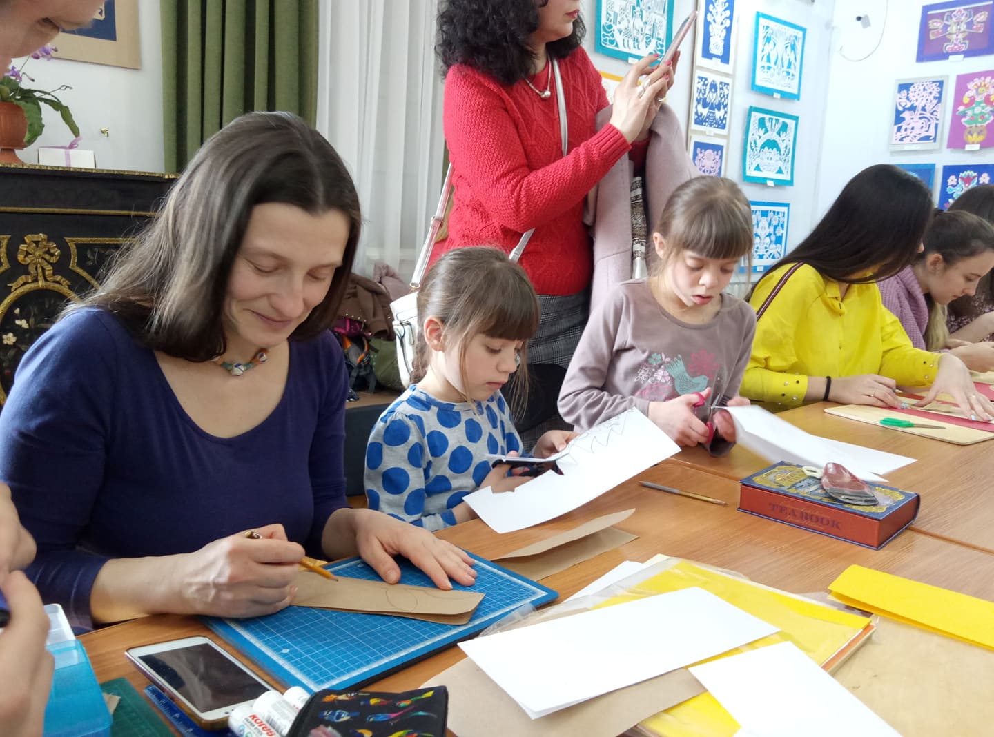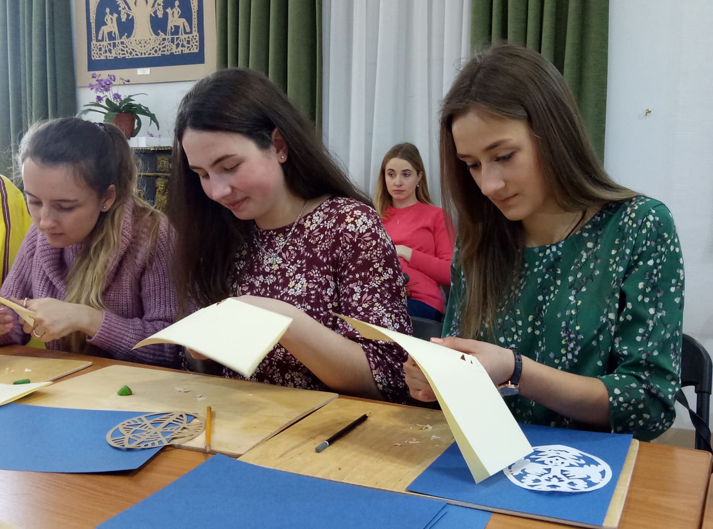 – Тема нашої витинанки – “Дерево життя”, – каже пані Світлана. – Ми будемо виготовляти листівки до дня Великодня. Головна фігура сьогодні у наших роботах – квітки, вазони дерева, горщик з насінням – усі вони уособлюють зв`язок з своїм родом. І це дуже важливо, тому що кожен має знати історію свого роду, хоча б кілька своїх пращурів.
