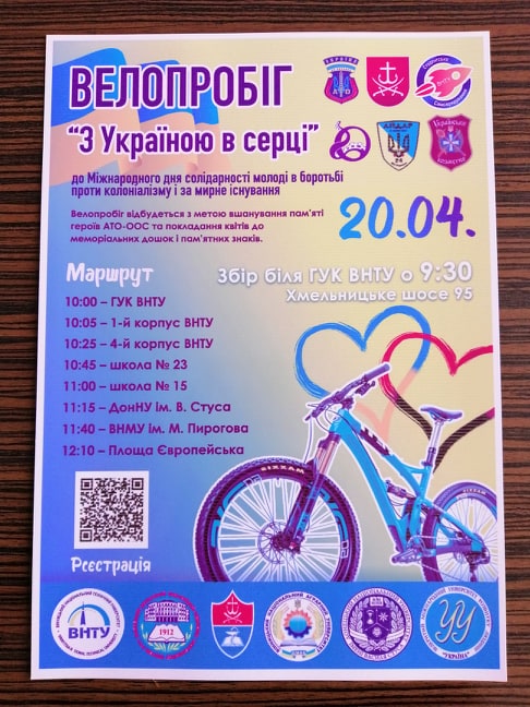 Сьогодні, 18 квітня, відбулась прес-конференція, на якій анонсувався патріотичний велопробіг «З Україною в серці». За два дні, тобто в суботу, 20 квітня, студенти вінницьких вишів відзначать Міжнародний день солідарності молоді в боротьбі проти колоніалізму і за мирне існування. Ідея відзначити цей день у такий спосіб виникла у студентів Вінницького національного технічного університету. Співорганізатори – національний медичний університет ім.М.Пирогова, Донецький національний університет ім.В.Стуса та школи №23 та №15.