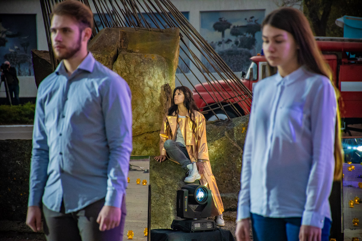 Руслана з’явилась одягнена у золотий плащ, що так символічно нагадував сонячне світло та вітер, з яких продукується сучасна чиста енергія. Співачка попрямувала до сонячного годинника так званою «алеєю пам’яті». Поблизу Янгола-Сурмача, навколо сонячного годинника зі свічок, зібралися «тіні» тих, чиї життя забрала страшна Чорнобильська катастрофа.