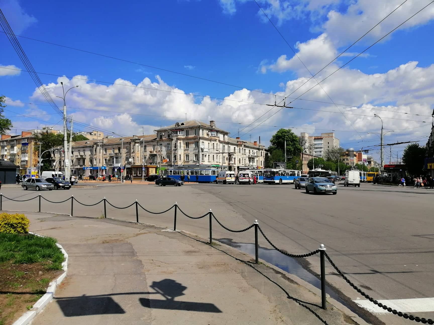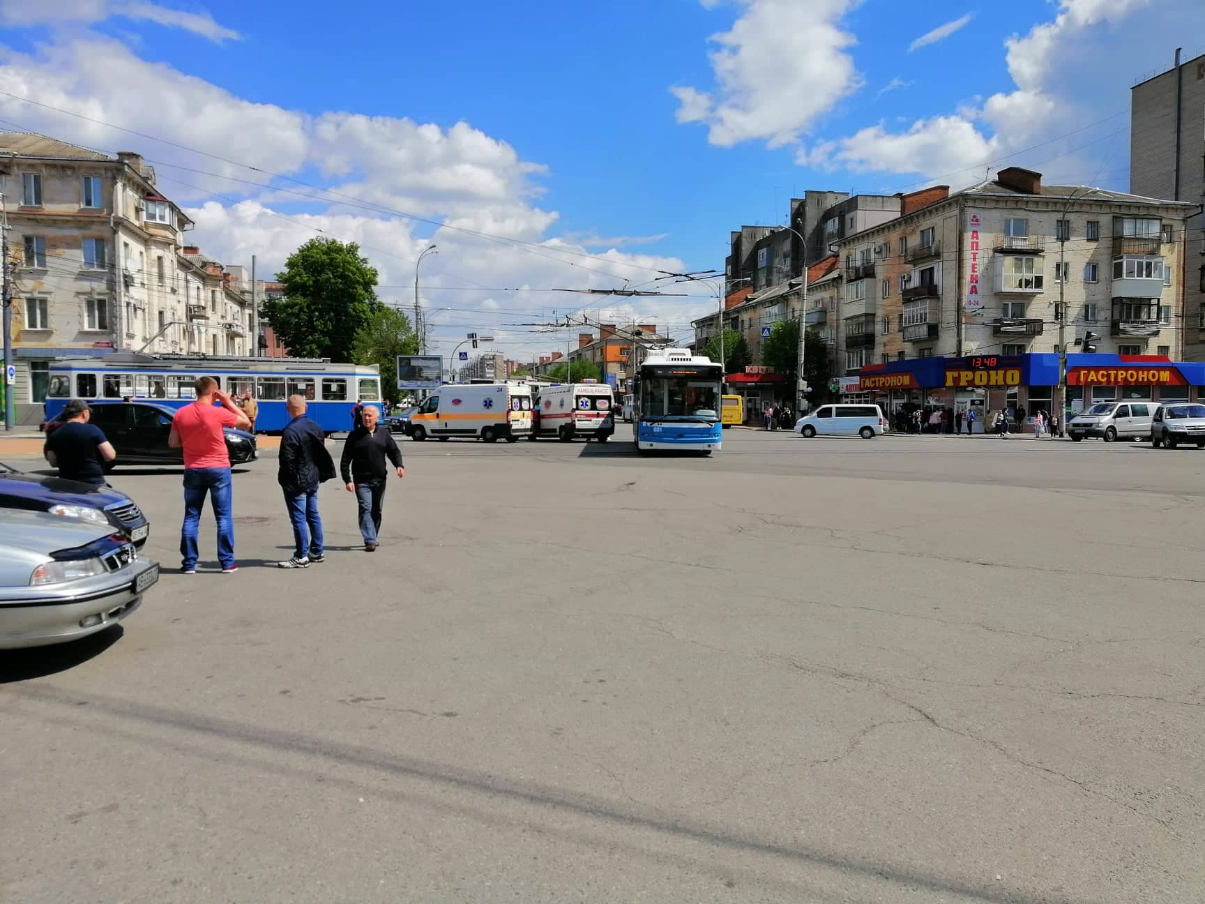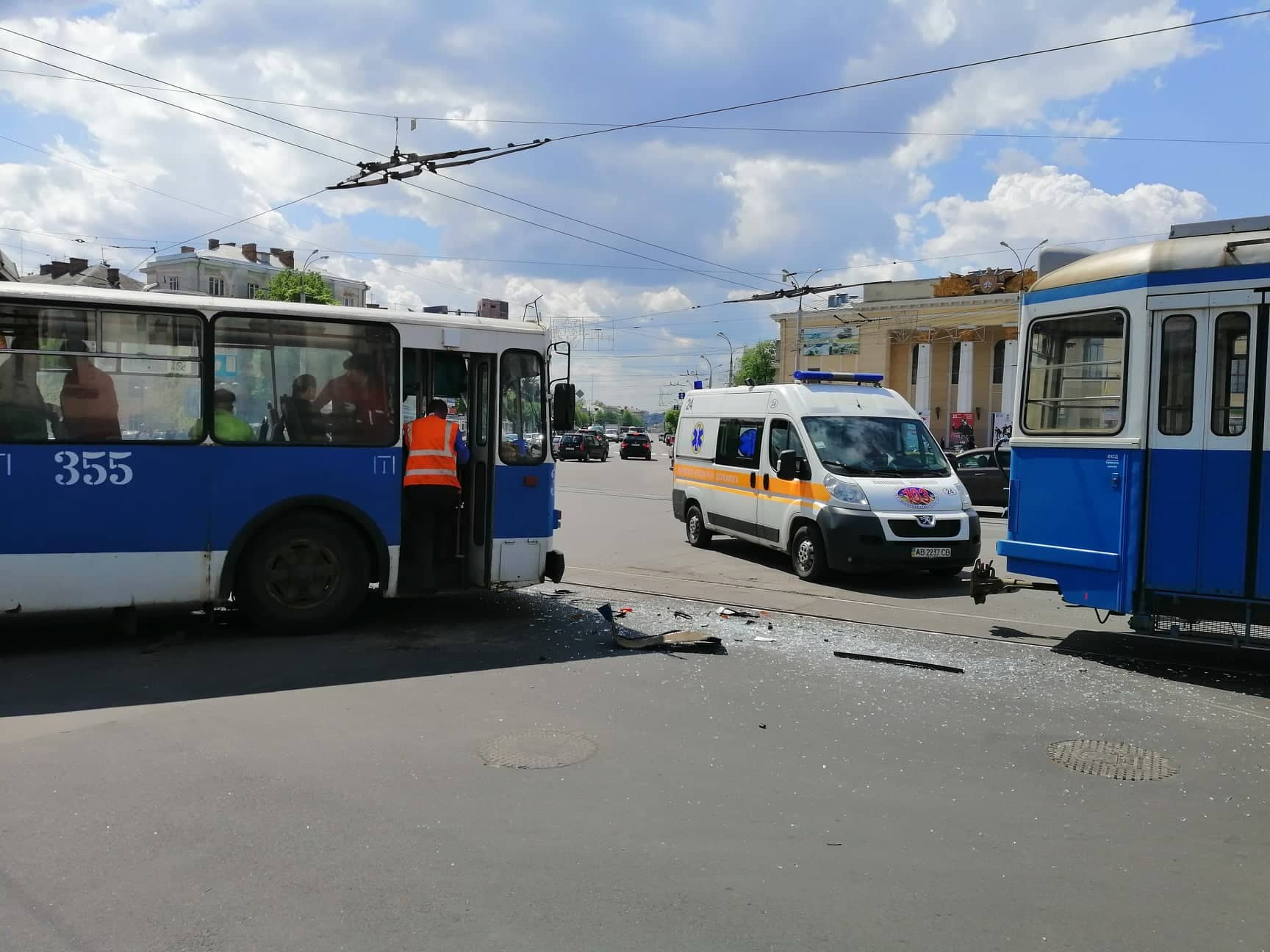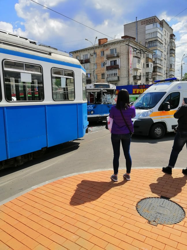 Сьогодні, 2 травня, у Вінниці близько 13.30 на перехресті пр.Коцюбинського та вул. Замостянської біля магазину «Гроно» сталася ДТП: тролейбус №5, який їхав із вокзалу, зіткнувся із трамваєм №6, що рухався з центру міста в бік вокзалу.