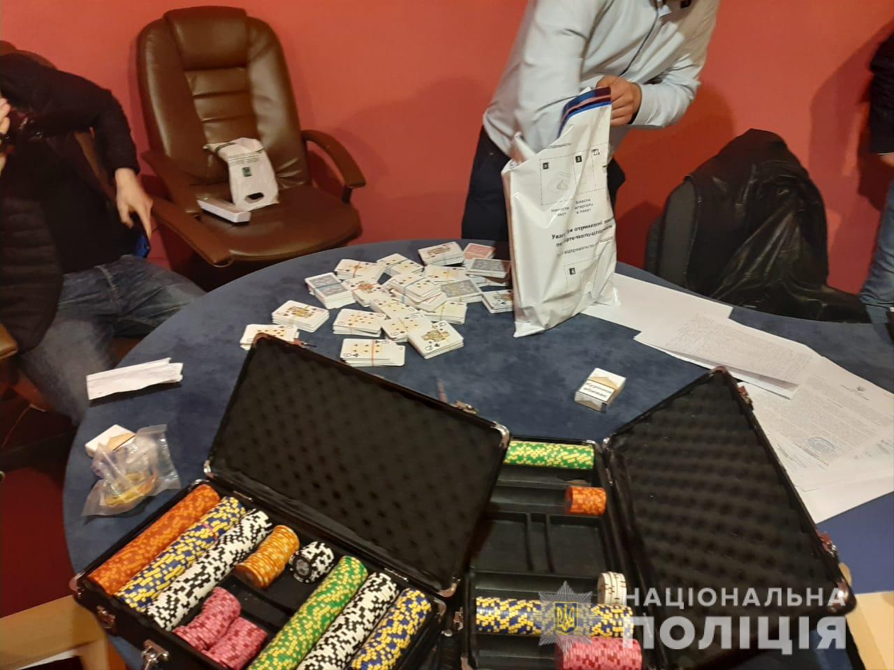 Під час проведення санкціонованого обшуку в приміщенні правоохоронці вилучили речові докази – колоди карт, набори з фішками, грошові кошти в гривнях та доларах США, столи, обладнані для гри в покер, записники з нотатками про борги осіб.