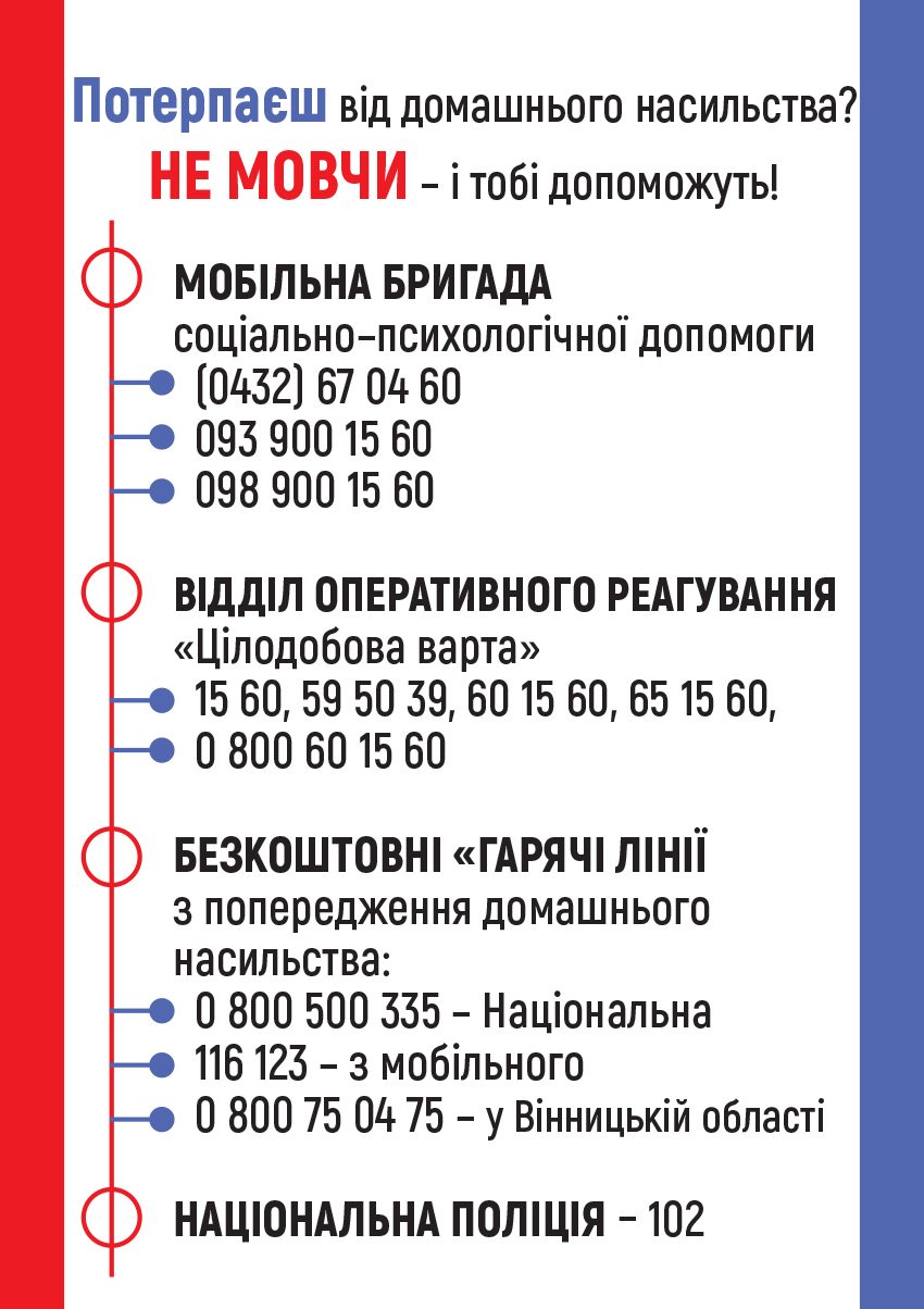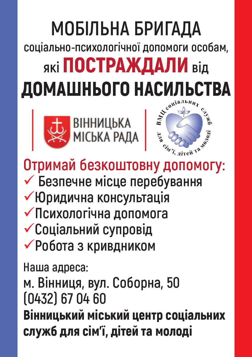 З 1 липня розпочала діяти Мобільна бригада соціально-психологічної допомоги людям, які постраждали від домашнього насильства або насильства за ознакою статі. Вона функціонує при Вінницькому міському центрі соціальних служб для сім’ї, дітей та молоді.