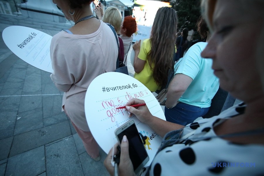 Учителі, які беруть участь в EdCamp, установили рекорд, створивши величезний напис-хештег #ВЧИТЕЛЮЙ на площі Конституції.