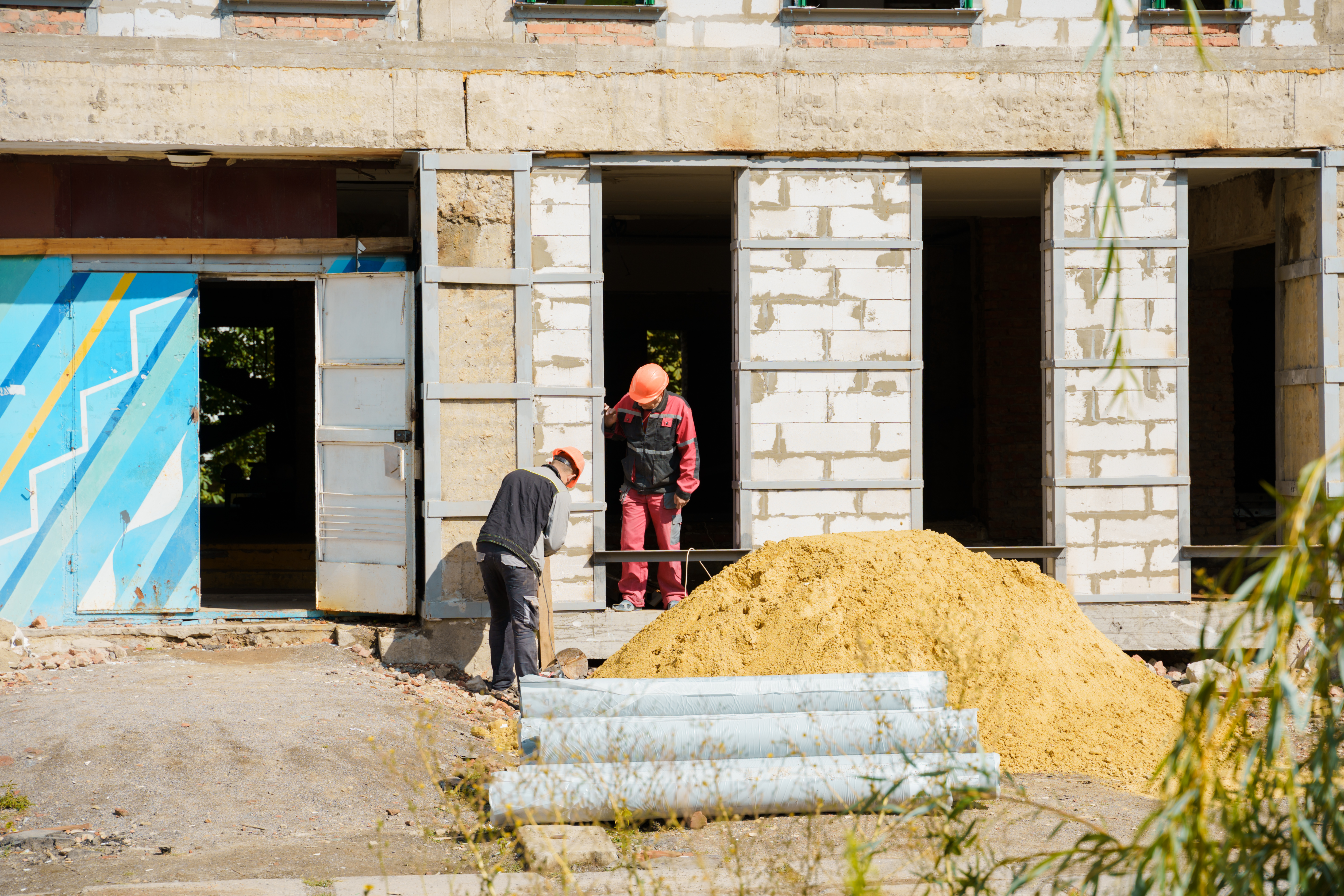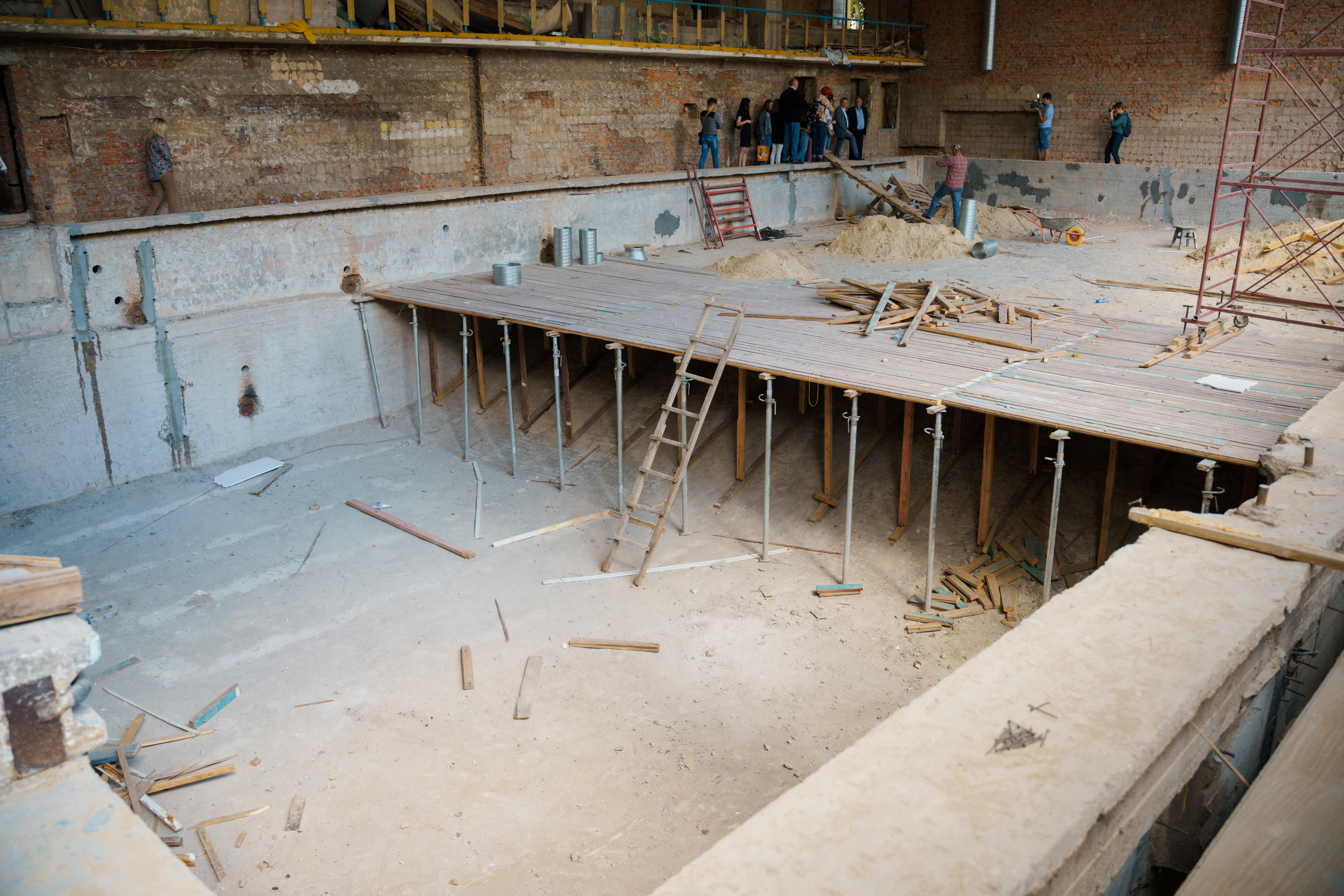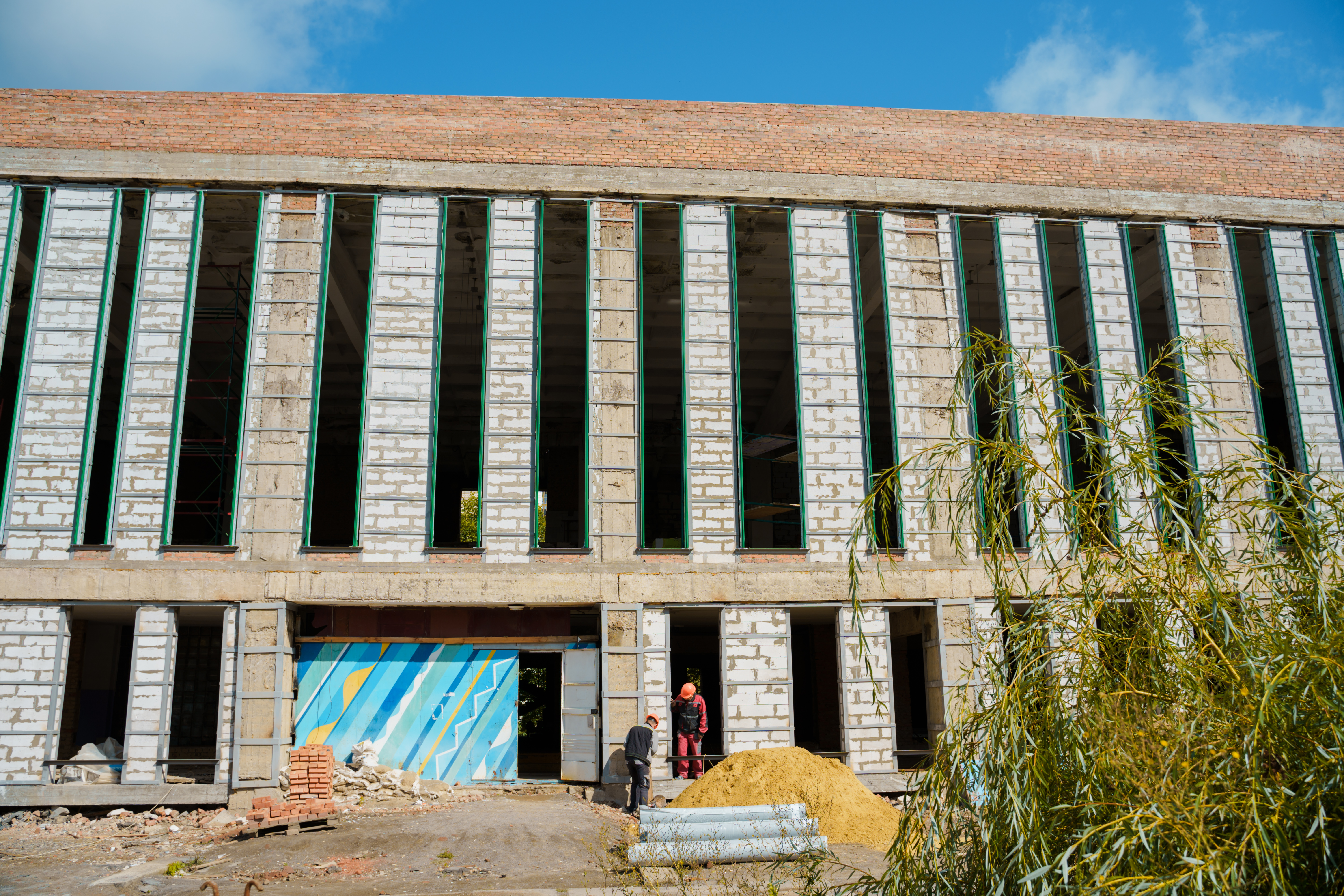 У спорткомплексі вже встановлено фундаментні балки під стіни першого поверху на південному фасаді, зроблено монолітні пояси на рівні покрівлі, нові віконні прорізи на фасадах будівлі. Завершується підсилення стін будівлі. Робітники утеплюють фасад, установлюють покрівлю. Виконано заміну двох прогонів та плит покриття приміщення басейну, роботи по підсиленню існуючих плит покриття. Замінено плити перекриття на обхідних доріжках басейну. Підсилено колони під чашею басейну, проводяться роботи по підсиленню чаші басейну. Виконується влаштування вентиляції, господарської каналізації та прокладка електропроводки.