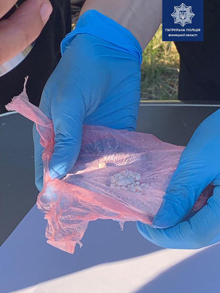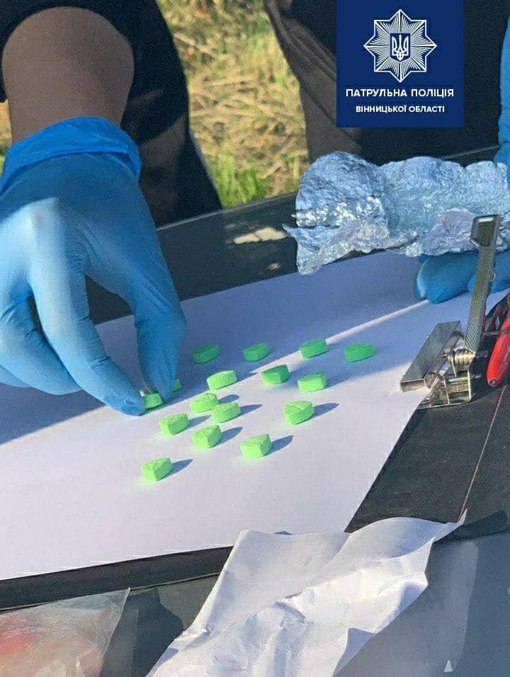 В салоні транспортного засобу патрульні виявили 62 таблетки, схожі на наркотики extasy, порошкоподібну речовину рожевого кольору та пакет з рослинною речовиною зеленого кольору.
