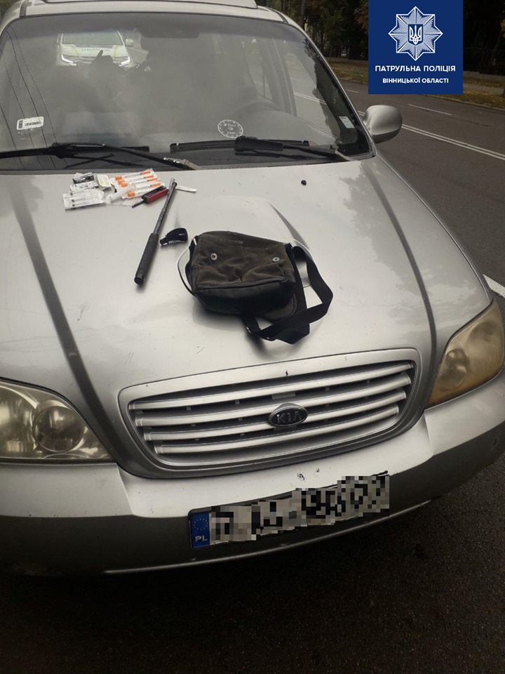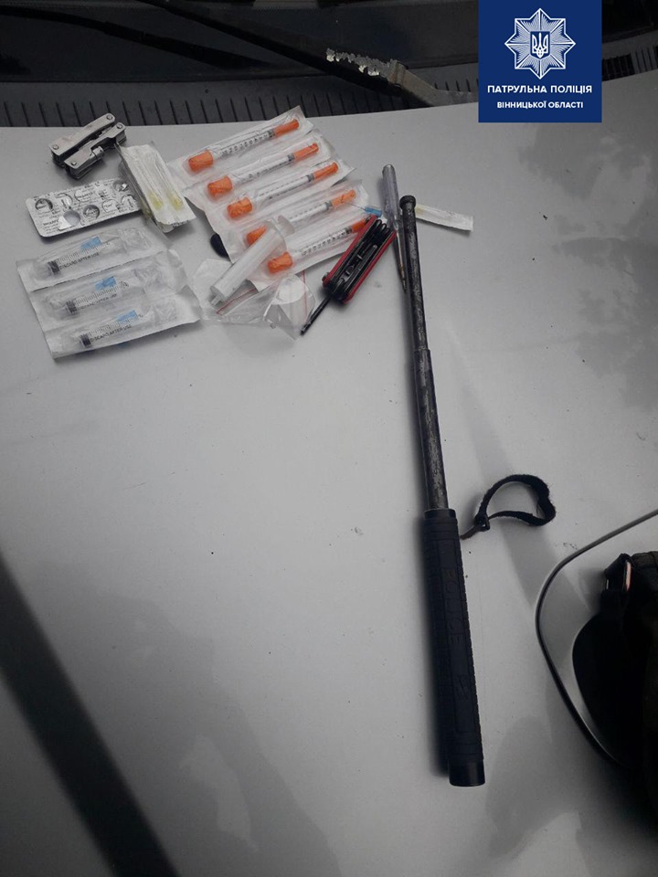 Крім того, поліцейські помітили, що водій дуже нервується, тому вирішили провести поверхневу перевірку його автомобіля. В салоні патрульні виявили шприци, а також сумку, в середині якої знаходився металевий предмет чорного кольору, зовні схожий на телескопічну биту.