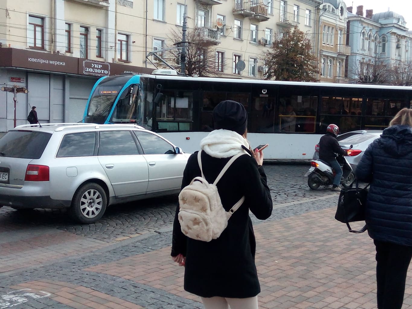 Наразі стало відомо, що на вулиці Соборній авто Volkswagen Crafter збив жінку на пішохідному переході навпроти мерії, а потім врізався в Hyundai Tucson. Оскільки все це сталося на трамвайних коліях, рух транспорту було заблоковано.