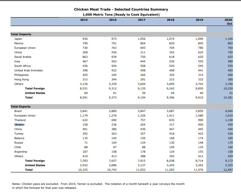 Згідно з прогнозом відомства, у 2019 році Україна збільшить експорт курятини на 26% – до 400 тис. т у річному численні. У 2020 році поставки української курятини за кордон становитимуть 450 тис. т, прогнозують американці.