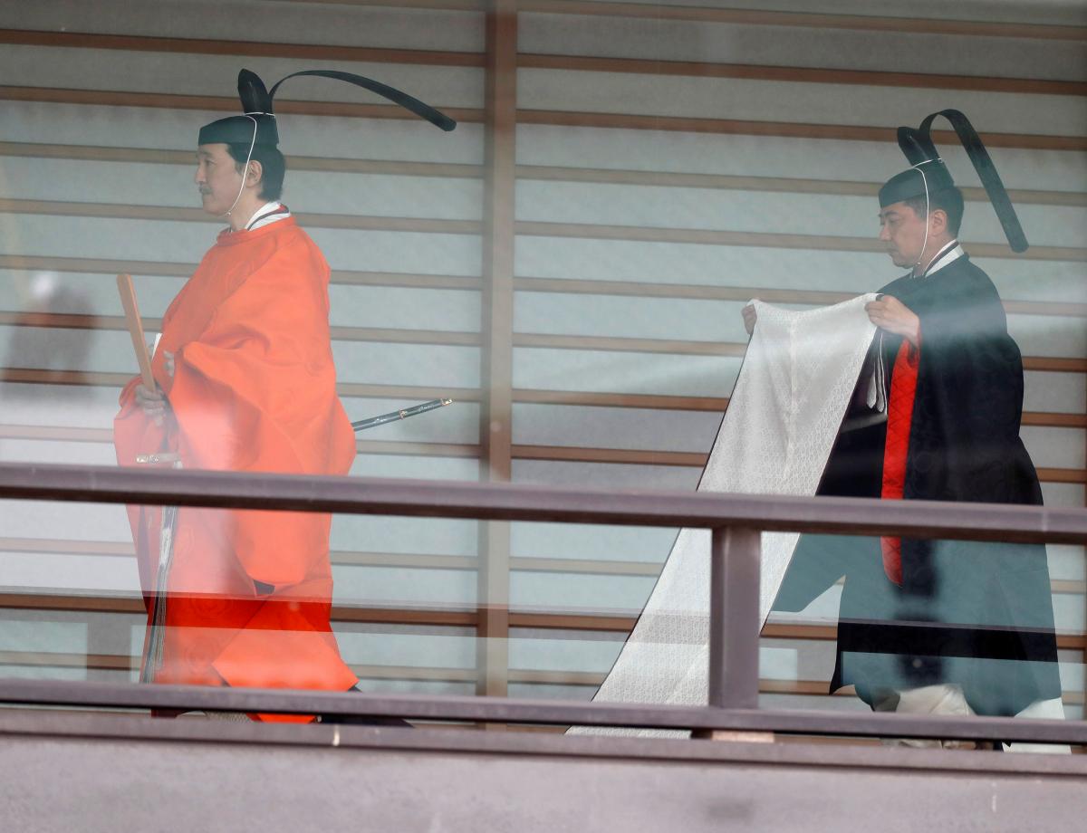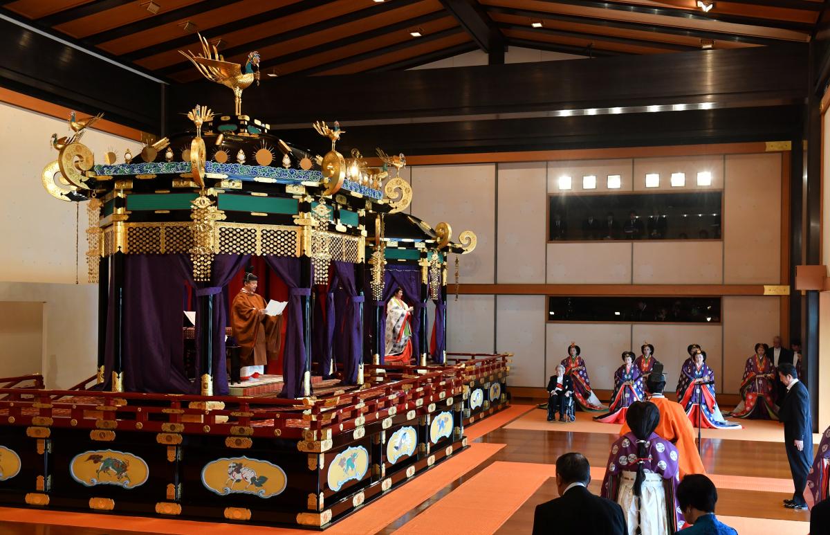 На церемонію новий імператор прибув в оранжевому традиційному вбранні. Про сходження на престол Нарухіто оголосив з 6,5 метрового трону, який виготовили на початку ХХ століття за старовинними зразками.