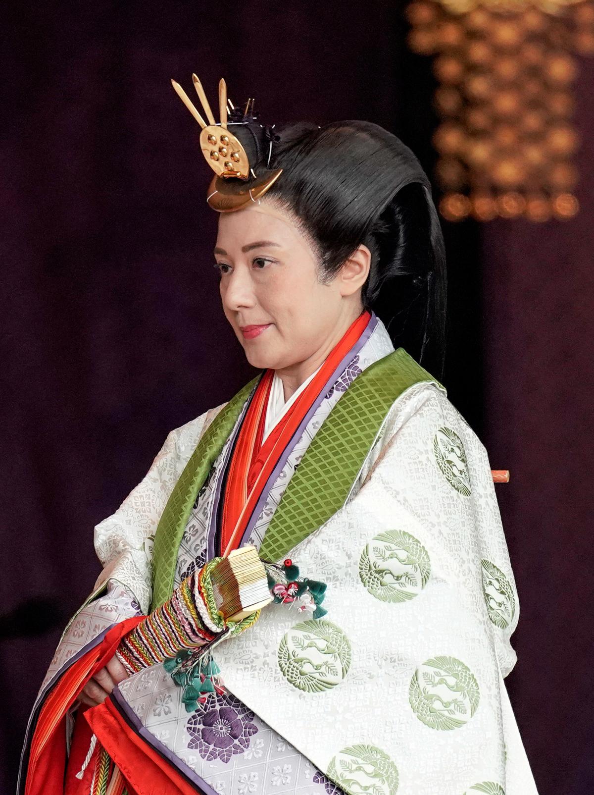 Дружина імператора надягнула об’ємне 12-шарове кімоно, зшитого за середньовічними лекалами; її трон був меншим.
