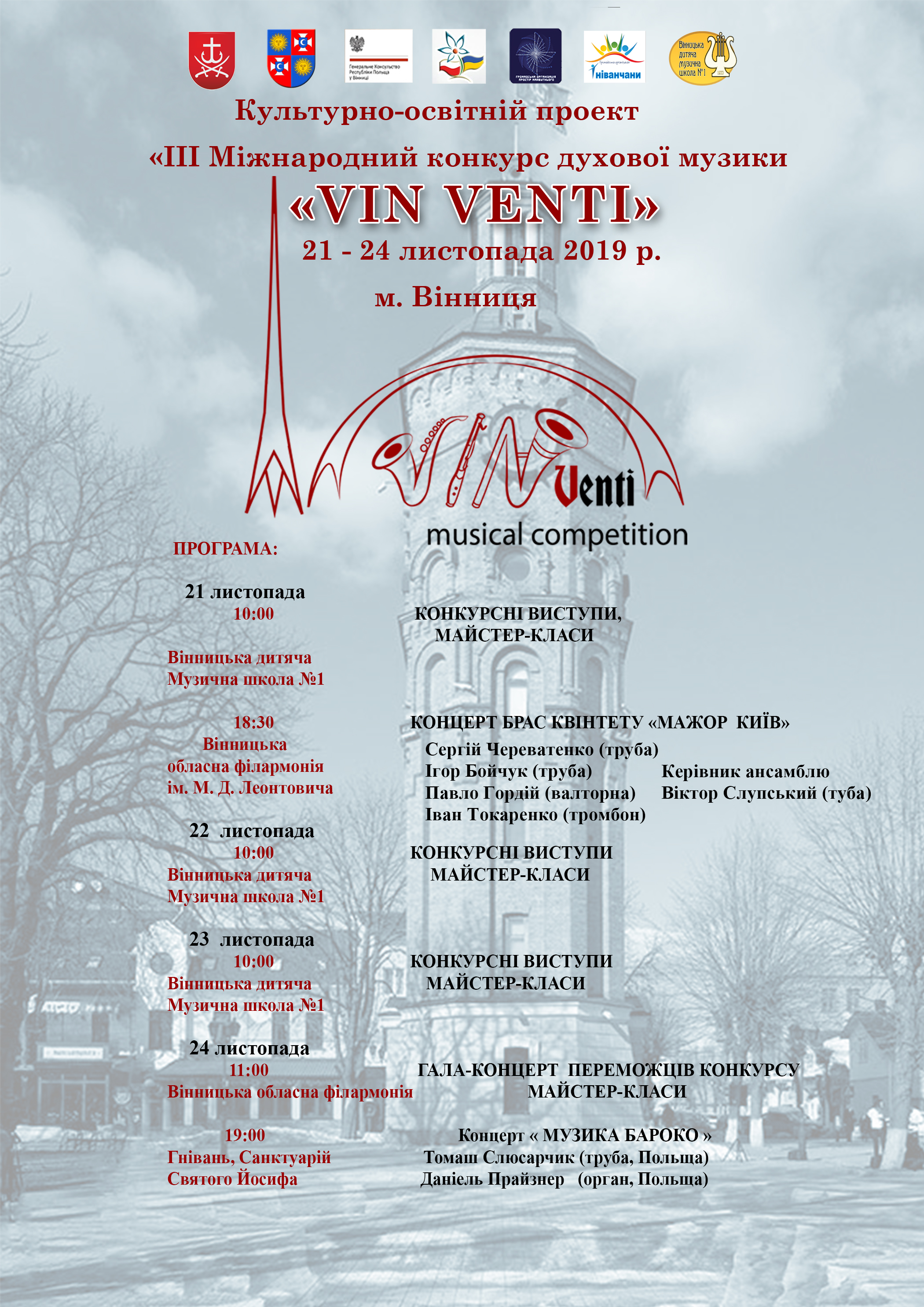 У четвер, 21 листопада, у Вінниці розпочнеться IІІ Міжнародний конкурс духової музики «VIN VENTI». У конкурсі беруть участь солісти-інструменталісти дерев’яних духових та мідних духових інструментів мистецьких шкіл, спеціалізованих мистецьких шкіл-інтернатів та спеціалізованих мистецьких навчальних закладів усіх рівнів акредитації України та країн зарубіжжя. Оцінюватимуть конкурсантів професійні педагоги та музиканти з України, Польщі та Франції.