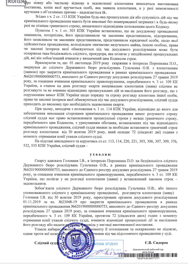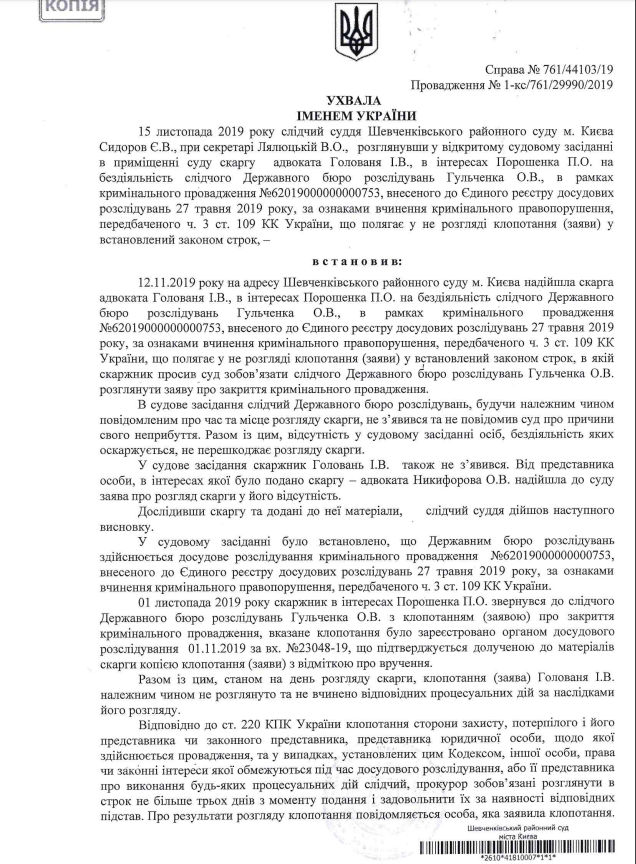 • Так звана “підозра”, виставлена в Телеграмі  заступником глави адміністрації Януковича Портновим, а згодом – скопійована прес-службою ДБР, є нічим іншим, як російським замовленням на завдання шкоди репутації п’ятого президента,  а також спробою перешкодити Петру Порошенку провести низку зустрічей з іноземними лідерами на саміті Європейської народної партії у Хорватії та на безпековому форумі в Галіфаксі (Канада). Із останніх сил чіпляючись за крісло, що швидко вислизає, Директор ДБР Роман Труба викинув останній козир – проект повідомлення про підозру п’ятому президенту України. Поспіх Труби та його наставника Портнова обумовлений не тільки близьким звільненням керівника ДБР. Адже 15 листопада Шевченківський суд зобов’язав ДБР розглянути клопотання про закриття саме цього провадження. І конвульсії Труби – всього лише спроба ухилитися від виконання судового рішення.