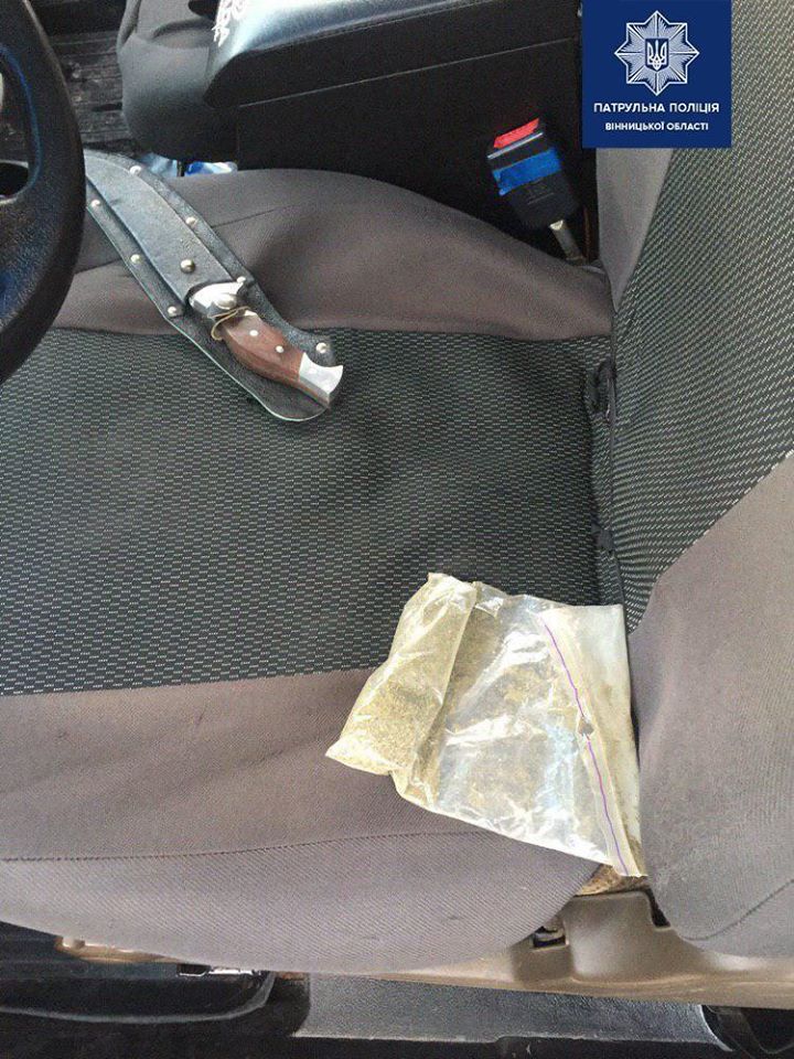 В салоні автівки під сидінням поліцейські побачили поліетиленовий пакет з речовиною зеленого кольору в подрібненому стані, зовні схожою на наркотичну. Там же патрульні виявили і предмет, схожий на пістолет, без відповідного дозволу, а в бардачку автомобіля – ніж, який мав ознаки холодної зброї.