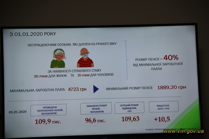 Законом України «Про Державний бюджет України на 2020 рік» передбачено зростання мінімальної заробітної плати у 2020 році до рівня 4723 грн. У зв’язку з цим, з 1 січня 2020 року буде перераховано мінімальний розмір пенсійних виплат для непрацюючих пенсіонерів, які досягли віку 65 років та мають страховий стаж не менше 30 років для жінок та 35 років для чоловіків.