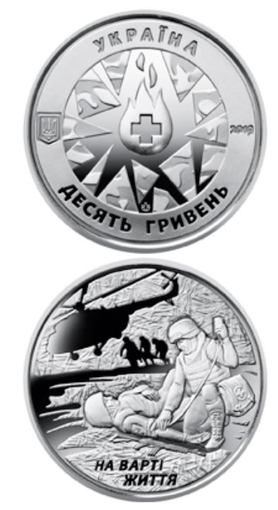 На аверсі монети розміщено: малий Державний Герб України (ліворуч), напис Україна (угорі півколом), рік карбування монети 2019 (праворуч), номінал Десять гривень (півколом унизу); у центрі – стилізовану композицію: полум’я, на тлі якого – хрест, символ медицини, навколо – камуфльовані уламки, що символізують драматизм війни; унизу між уламками – логотип Банкнотно-монетного двору Національного банку України.