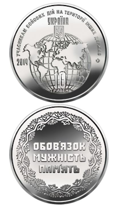На аверсі монети розміщено: малий Державний Герб України, над яким напис Україна; на дзеркальному тлі – стилізовану композицію: на тлі моделі Землі зображено континенти та зазначено номінал 10 гривень (унизу); рік карбування монети 2019 (ліворуч); логотип Банкнотно-монетного двору Національного банку України (праворуч); напис Учасникам бойових дій на території інших держав (угорі півколом).