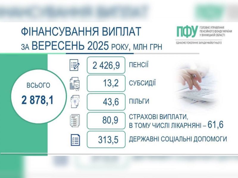Як повідомили в ГУ ПФУ у Вінницькій області, на фінансування видатків вересня 2025 року спрямовано 2878,1 млн грн, в тому числі на виплату: