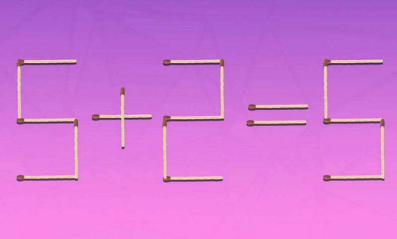 Нижче ви побачите зображення, де сірниками викладено рівняння 5+2=5. Загалом було використано 19 сірників.